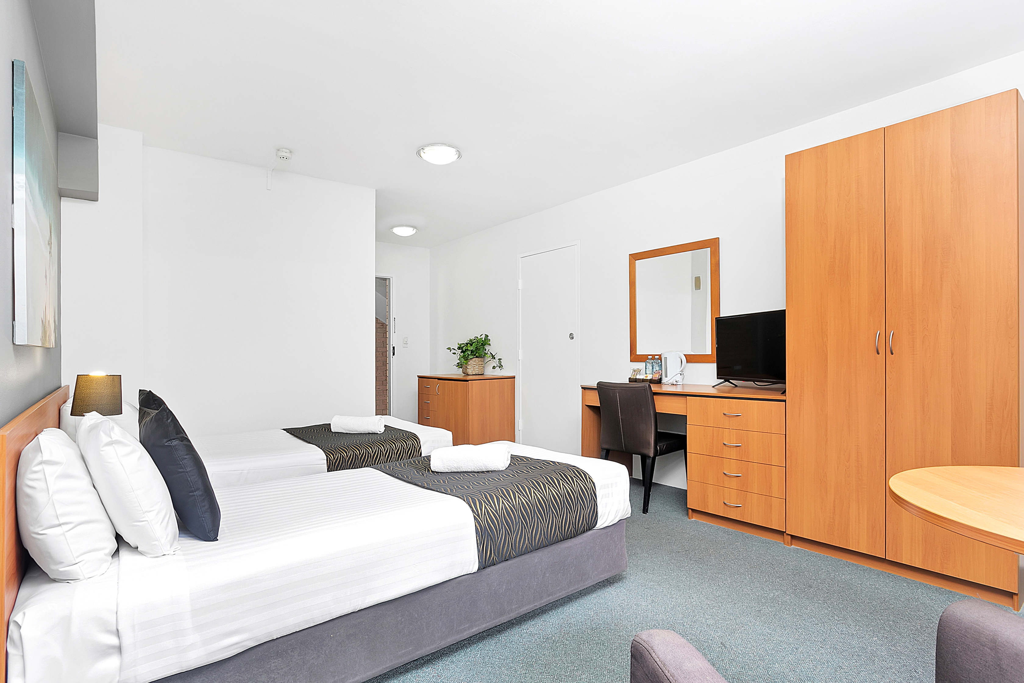 The Standard Twin Single can accommodate up to 2 guests using two single beds with a pillow top. This room includes small dining area, as well as an ensuite bathroom with shower. Other features include an Air-conditioning, tea/coffee making facilities, small private balcony and a flat-screen TV.